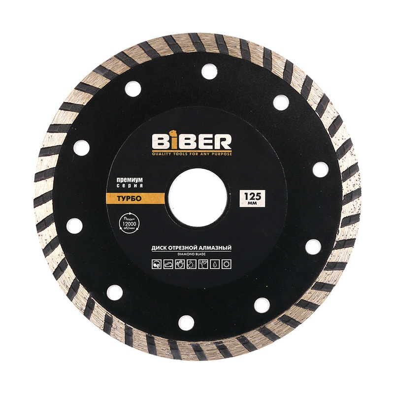 Используется в качестве насадки на УШМ (болгарки), электрические плиткорезы и штроборезы. Предназначен для резки бетона, кирпича, керамогранита, гранита, мрамора и другого природного и искусственного камня. Обладает высокоскоростными показателями резки, но требует последующей чистовой обработки. Диск Турбо дает более чистый срез, чем сегментный, но имеет менее высокую производительность, так как нуждается в перерывах в работе для исключения перегрева. Серия Премиум отличается особенными свойствами режущей кромки (за счет повышенной концентрации алмазов), что увеличивает производительность и долговечность диска. Желательно водяное охлаждение во время работы.