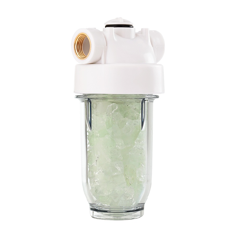 Состоит из крышки фильтра, которая имеет два варианта подключения к водопроводу (прямое и угловое), и колбы, наполненной кристаллами полифосфатной соли.