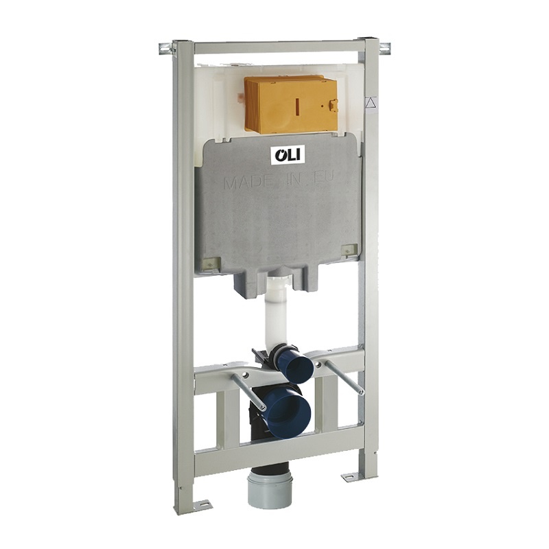 Позволяет "скрытно" установить бачок слива, оставляя на виду только сам унитаз и кнопку слива. Основными элементами инсталляции являются специальная стальная рама с установленным на ней бачком, в котором находятся сливной и наливной клапан. Подходит для монтажа к капитальным несущим стенам и к легким стенам на стадии возведения перегородки прямо в стальной профиль, который потом обшивают гипсокартонными листами.