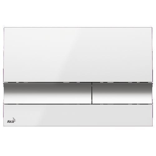 Кнопка управления Alcaplast M1720-1 системы инсталляции изготовлена из ударопрочного пластика, основная панель из белого цвета, кнопки малого и большого смыва - хромированный глянец. Предназначена для осуществления смыва в скрытых системах инсталляции Alcaplast.