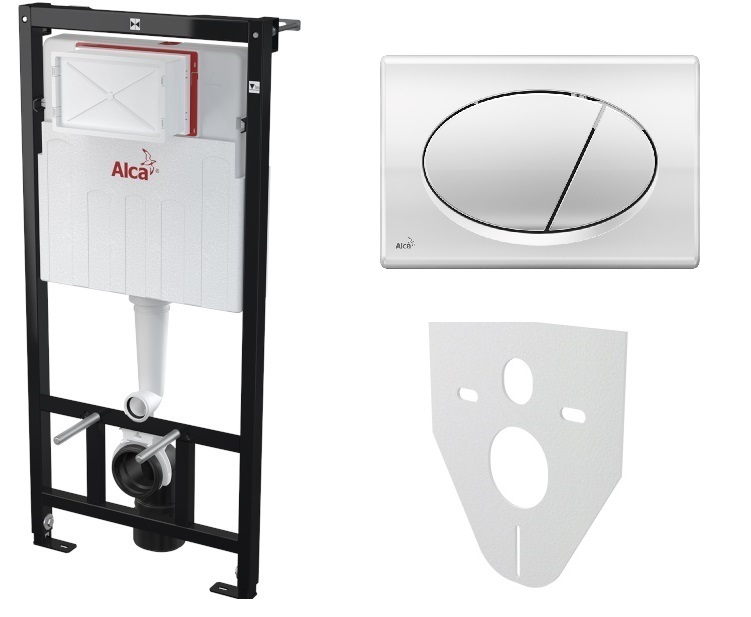 В комплект системы инсталляции подвесного унитаза 4 в 1 входит система инсталляции Alcaplast AM101/1120 Sadromodul, хромированная кнопка двойного смыва Alcaplast M71, звукоизоляционная плита Alcaplast M91, крепления для инсталляции и подключения для подвесного унитаза.