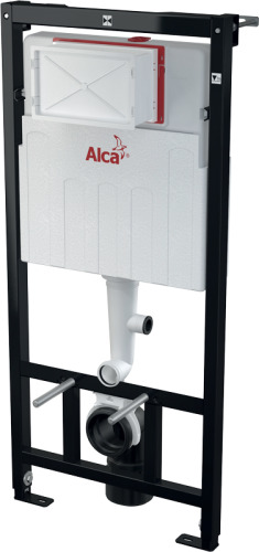 Сливной бачок инсталляции Alcaplast бесшовный и покрыт изоляцией, которая выполняет функции шумоизоляции и предотвращает появление конденсата. Бачок оборудован регулируемым механизмом двойного слива на 3/6 литра (малый/полный смыв), что позволяет экономить расход воды при необходимости. Монтажная рама выдерживает нагрузку до 400 кг (включая человека на унитазе), расстояние рамных болтов для крепления подвесного унитаза стандартное и составляет 180 или 220 мм. Инсталляция совместима со всеми кнопками управлениями Alcaplast.