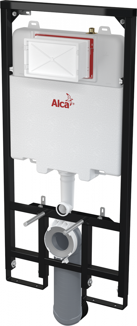 Система инсталляции подвесного унитаза спроектирована и произведена на заводе чешской фирмы Alcaplast. Предназначена для скрытого монтажа к несущей стене или в гипсокартонную стену и применяется для установки подвесного унитаза в ванных комнатах или туалетах. Представляет собой конструкцию из металлической рамы, на которой установлен сливной бачок с впускной и сливной арматурами, монтажной коробки для кнопки слива, необходимые фитинги для подключения подвесного унитаза к системе канализации и монтажные крепления.