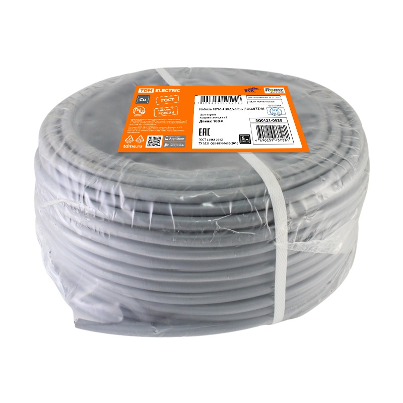 Кабель NYM 3х2,5 мм2, серый, бухта-100 п.м. ГОСТ 31996-2012