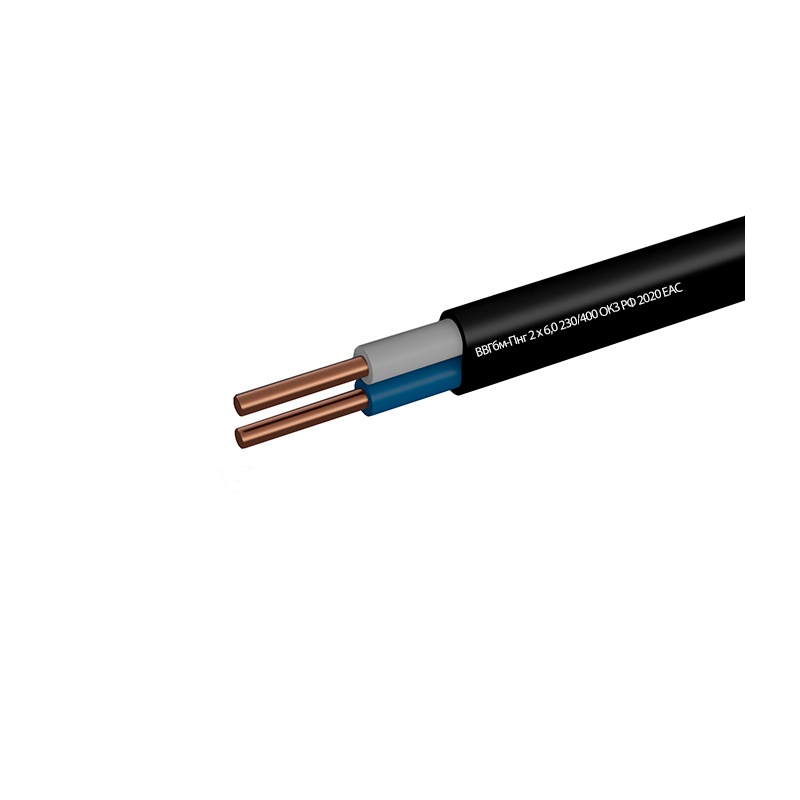 Предназначен для прокладки осветительных и силовых электрических цепей, внутри помещений, в кирпичных и бетонных стенах, в кабель-каналах, а так же на улице вне прямого воздействия солнечных лучей. Кабель имеет медные токопроводящие жилы в ПВХ изоляции. Буквенные обозначения ВВГ означают: В - изоляция из ПВХ, В - оболочка из ПВХ, Г- отсутствие защитного покрова ("голый"), нг - не поддерживающий горение. Маркировка 2х6,0 - две жилы сечением 6,0 мм2.