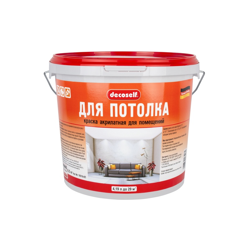 Латексная краска для окраски потолков внутри сухих и влажных отапливаемых помещений. Применяется при проведении окрасочных работ внутри отапливаемых помещений по всем типам минеральных поверхностей за исключением известковых штукатурок. Средний расход: 8 -10 м²/л (150-190 г/м²) на однослойное покрытие, 40 м²/10 л – при двухслойном покрытии.