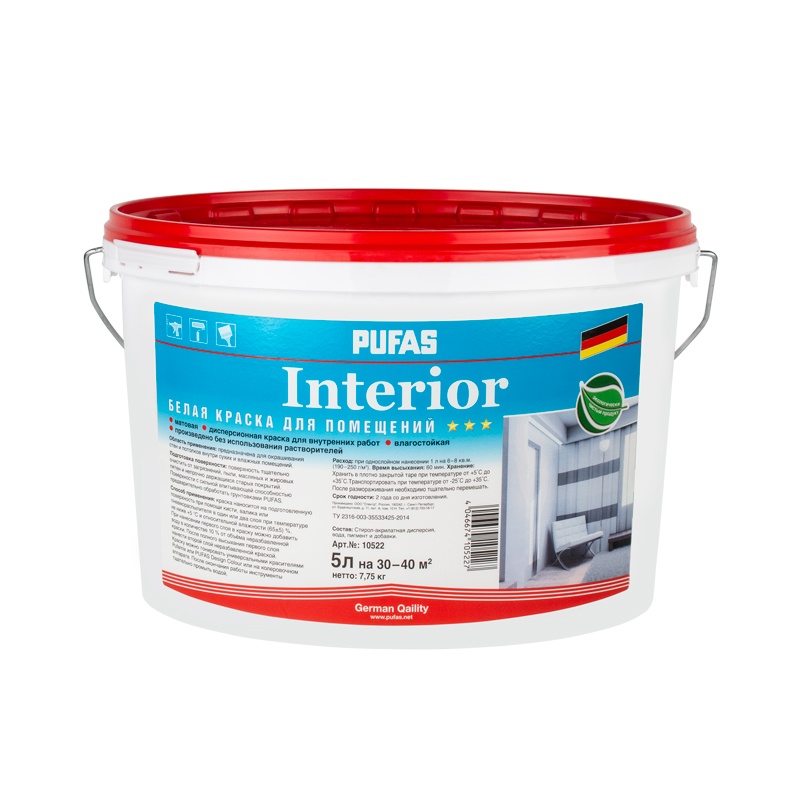 Интерьерная акрилатная (акриловая) латексная краска для профессионального применения внутри жилых помещений. Влагостойкая, высокая степень белизны при доступных для профессионального строителя ценах. Применяется при проведении окрасочных работ внутри любых помещений. Рекомендуется для окраски жилых и офисных помещений. Расход: 8 м2/л (190 г/м2) на однослойное покрытие, 40 м2/10 л - при двухслойном покрытии. Время высыхания до степени "3" составляет не более 60 минут при температуре окружающей среды (25±2) °C и относительной влажности воздуха (65±5) %. При низких температурах и высокой влажности сроки высыхания увеличиваются.