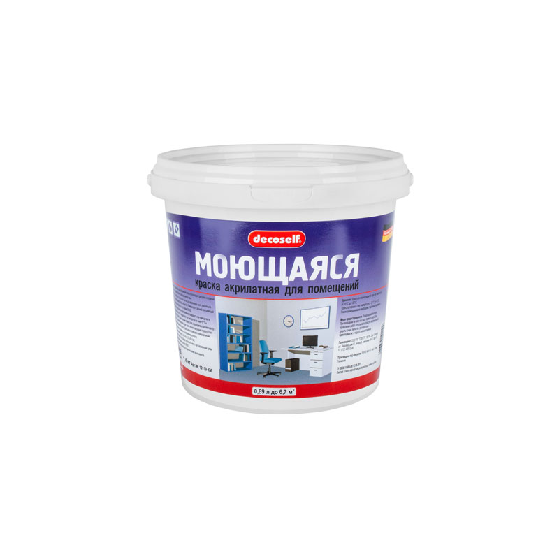 Матовая моющаяся акрилатная (акриловая) латексная краска для окраски стен и потолков внутри сухих и влажных помещений.