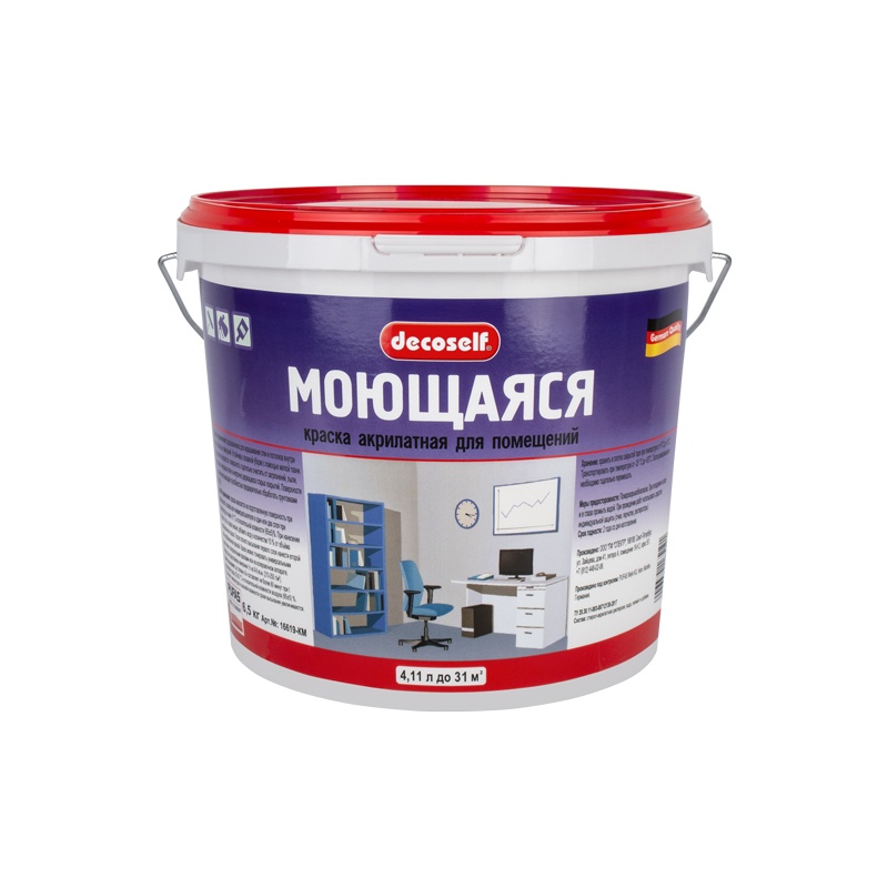 Моющаяся акрилатная (акриловая) латексная краска для окраски стен и потолков внутри сухих и влажных помещений. Применяется при проведении окрасочных работ внутри любых помещений. Рекомендуется для окраски детских садов, школ, ВУЗов, больниц, гостиниц. Допускает регулярное мытье мягкой тканью или губкой с применением неабразивных бытовых моющих средств. Расход: 5 м²/кг (200 г/м²) на однослойное покрытие, 100 м²/40 кг - при двухслойном покрытии. Время высыхания до степени "3" составляет не более 60 минут при температуре окружающей среды (25 ±2) °С и относительной влажности воздуха (65 ±5) %. При низких температурах и высокой влажности сроки высыхания увеличиваются.