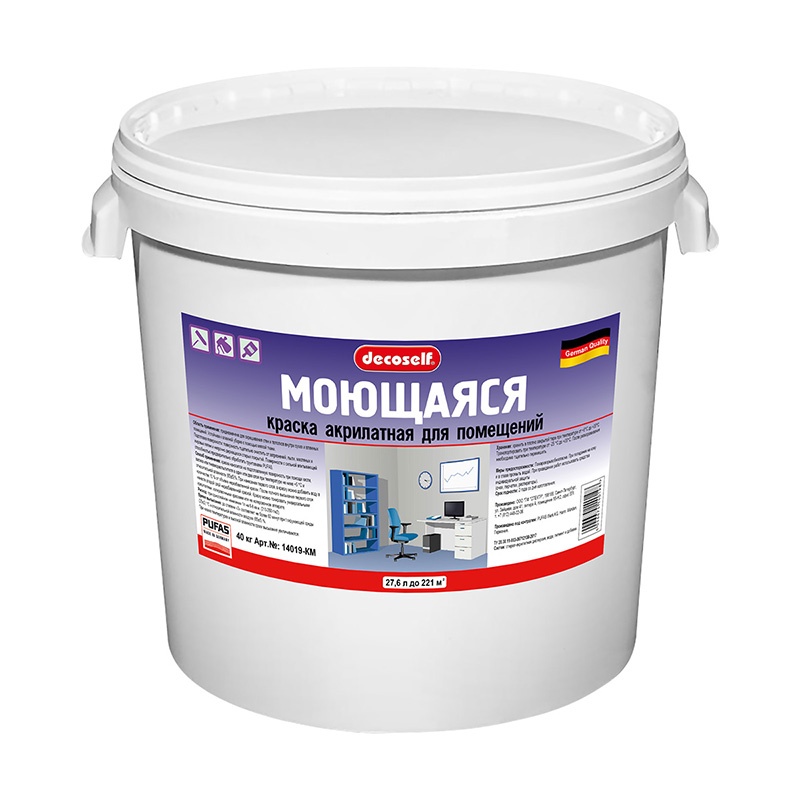 Моющаяся акрилатная (акриловая) латексная краска для окраски стен и потолков внутри сухих и влажных помещений. Применяется при проведении окрасочных работ внутри любых помещений. Рекомендуется для окраски детских садов, школ, ВУЗов, больниц, гостиниц. Допускает регулярное мытье мягкой тканью или губкой с применением неабразивных бытовых моющих средств. Расход: 5 м²/кг (200 г/м²) на однослойное покрытие, 100 м²/40 кг - при двухслойном покрытии. Время высыхания до степени "3" составляет не более 60 минут при температуре окружающей среды (25 ±2) °С и относительной влажности воздуха (65 ±5) %. При низких температурах и высокой влажности сроки высыхания увеличиваются.