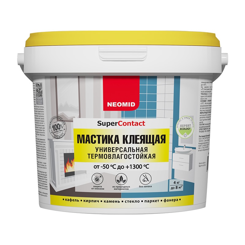 Мастика клеящая универсальная термостойкая, предназначенная для кладки и облицовки печей и каминов, склеивания различных поверхностей. Выдерживает перепад температур в диапазоне от -50°С до 1300°С. Применяется для склеивания кафельной и метлахской плитки, стекла, пенополистирольных плит и плиток ПВХ, дерева, картона, бетона, кирпича, натурального и искискуственного камня в любых сочетаниях, неглубокой шпатлевки оштукатуренных и бетонных поверхностей, наклеивания фанеры на стяжку (кроме поверхностей, имеющих постоянный контакт с водой). Расход на 1 слой: 0,5-1 кг/м². Время первоначального затвердевания клеевого шва из мастики: 1-3 часа. Полное затвердевание наступает от 72 до 120 часов.