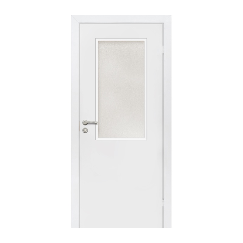 Полотно дверное с притвором остекленное, крашенное. Каркас - массив сосны и(или) МДФ. Сотовое картонное заполнение. Поверхность - плита ХДФ. Окрашено краской УФ-отверждения. Установлен замок модель 2014, установлены 2 резьбовые втулки с винтом для крепления петель. Выполнена фрезеровка 2-х отверстий под ручку и цилиндр (завертку).