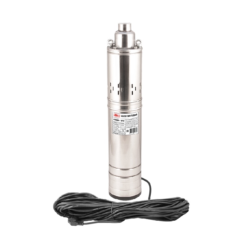Представляет собой погружной центробежный насос цилиндрической формы, который опускается в скважину и качает оттуда воду.