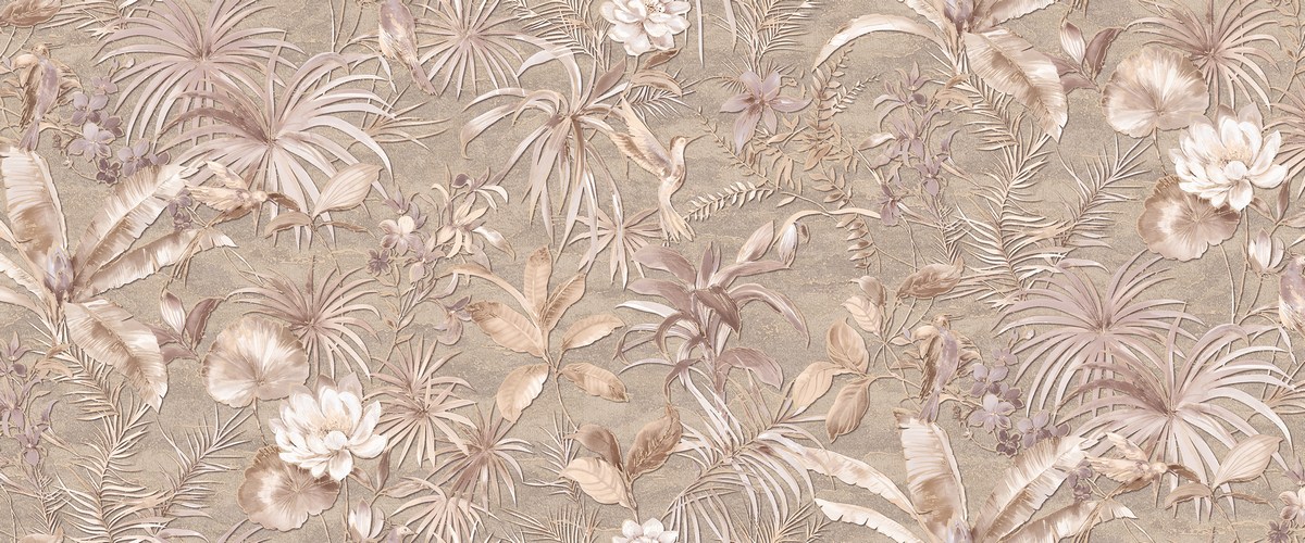 Ботаника и тропические мотивы - неиссякаемый и вдохновляющий источник для декора стен. Коллекция AMAZONIA от Victoria Stenova станет прекрасным украшением дома, его стилеобразующим элементом или ярким акцентом. Причудливые растения и птички, любовно прорисованы и выстроены в равномерную композицию, которая перекликается с великолепной сложной структурой фона, напоминающей песчаные дюны.