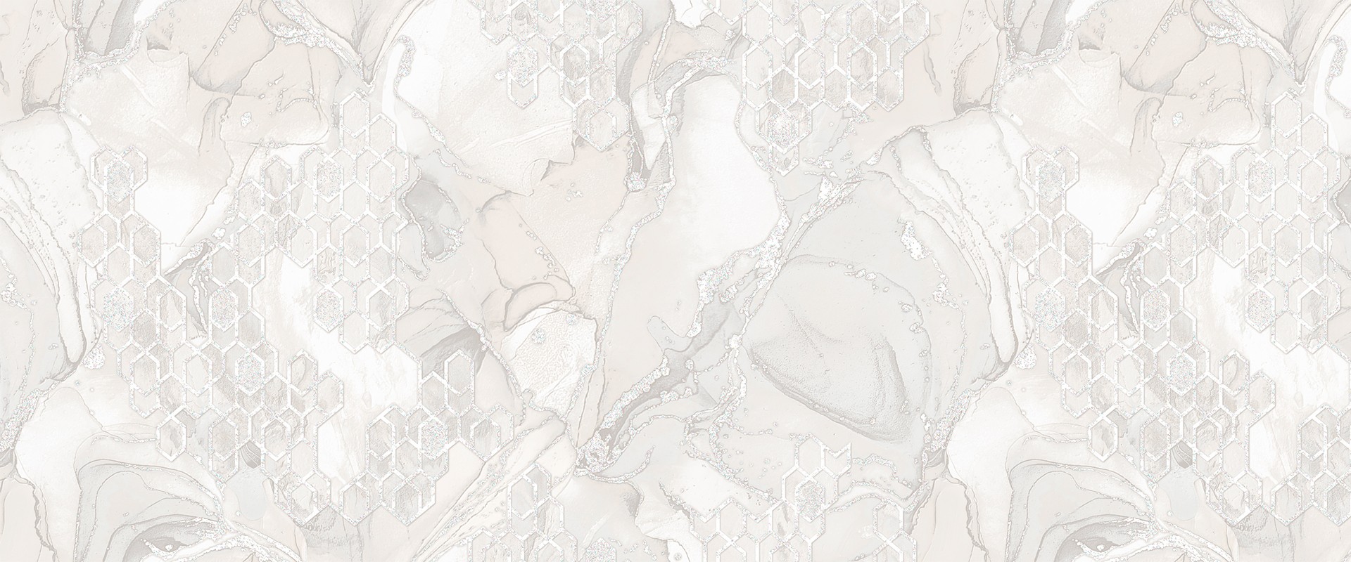 Гармония красивейшего природного материала в сочетании с теплотой и функциональностью обоев как материала, разнообразие красок, сочетание удивительных фактур погружают нас в мир тактильного и визуального удовольствия. Интересный и равномерный рисунок мрамора с необычной инкрустацией в виде вытянутых сот, мерцающий «дорогой» блеск и многообразие цветовых переходов с полутонами, подчеркивает выразительная тактильно теплая фактура полотна обоев.