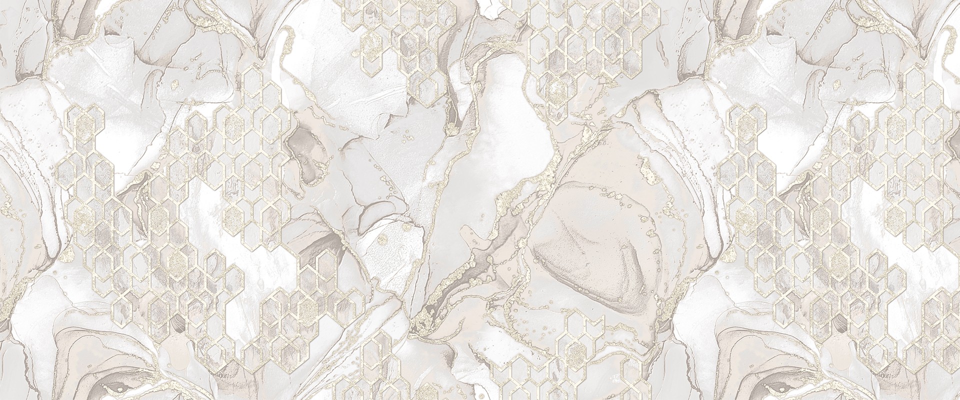 Гармония красивейшего природного материала в сочетании с теплотой и функциональностью обоев как материала, разнообразие красок, сочетание удивительных фактур погружают нас в мир тактильного и визуального удовольствия. Интересный и равномерный рисунок мрамора с необычной инкрустацией в виде вытянутых сот, мерцающий «дорогой» блеск и многообразие цветовых переходов с полутонами, подчеркивает выразительная тактильно теплая фактура полотна обоев.