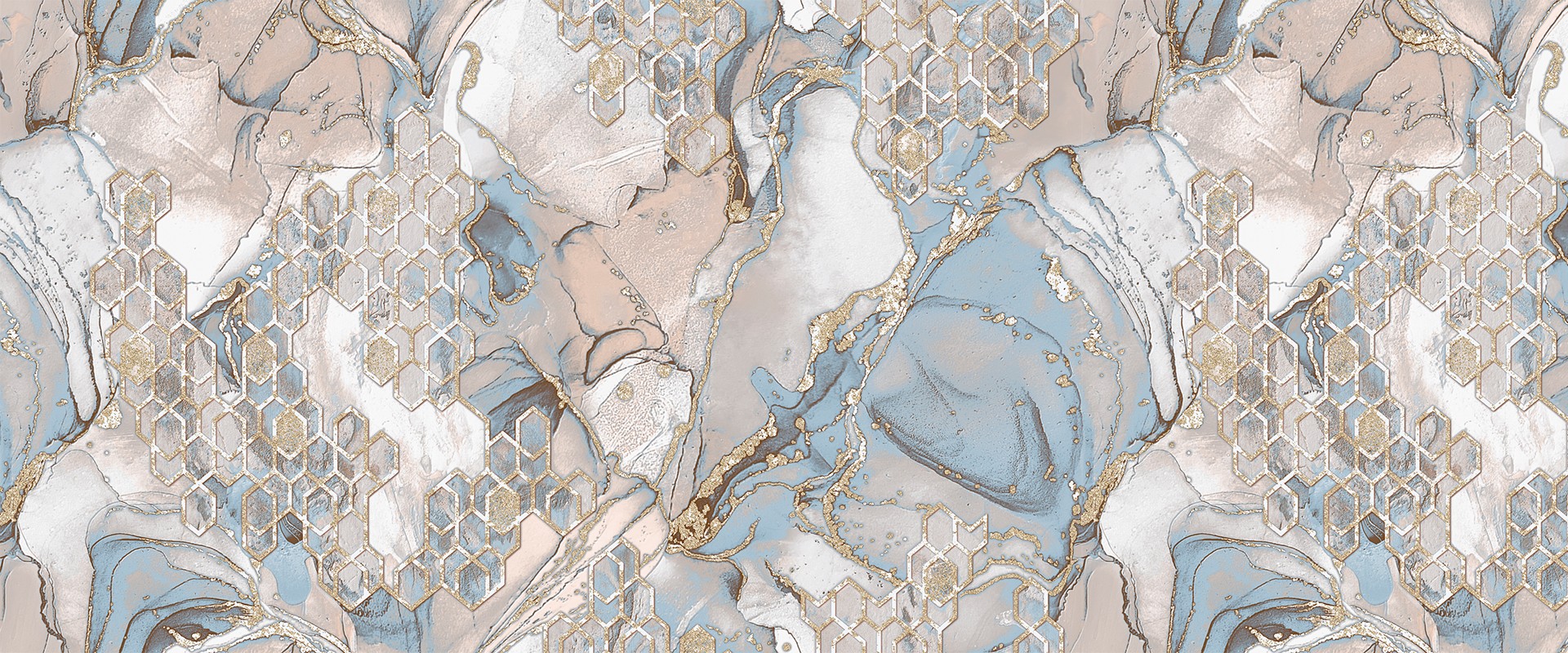 Гармония красивейшего природного материала в сочетании с теплотой и функциональностью обоев как материала, разнообразие красок, сочетание удивительных фактур погружают нас в мир тактильного и визуального удовольствия. Интересный и равномерный рисунок мрамора с необычной инкрустацией в виде вытянутых сот, мерцающий «дорогой» блеск и многообразие цветовых переходов с полутонами, подчеркивает выразительная тактильно теплая фактура полотна обоев.