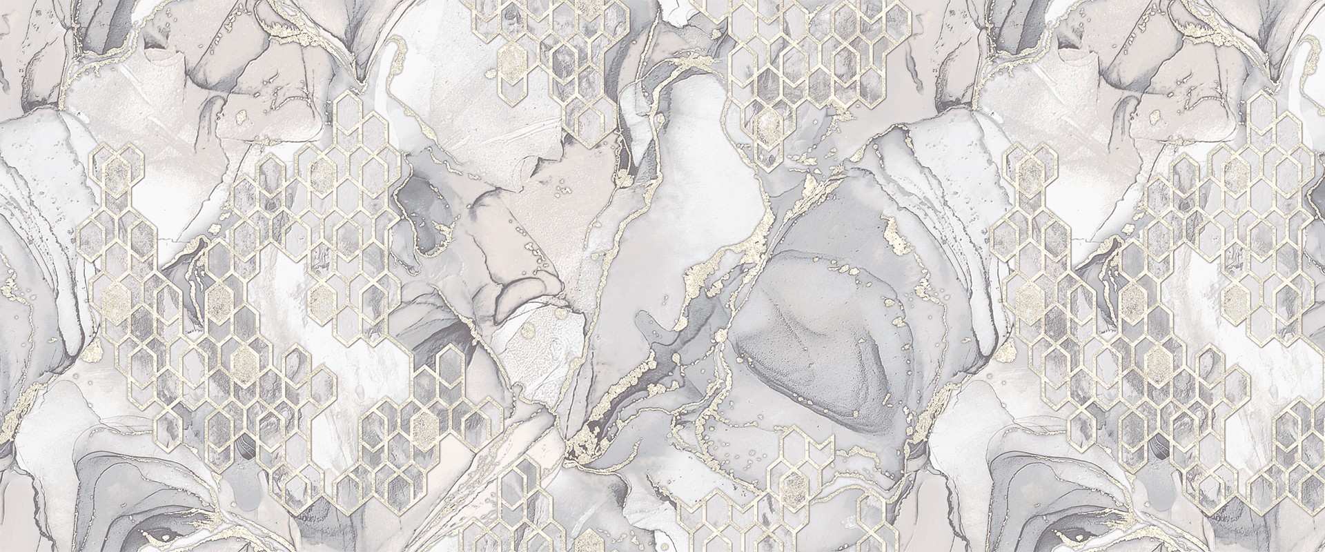 Гармония красивейшего природного материала в сочетании с теплотой и функциональностью обоев как материала, разнообразие красок, сочетание удивительных фактур погружают нас в мир тактильного и визуального удовольствия. Интересный и равномерный рисунок мрамора с необычной инкрустацией в виде вытянутых сот, мерцающий «дорогой» блеск и многообразие цветовых переходов с полутонами, подчеркивает выразительная тактильно теплая фактура полотна обоев.