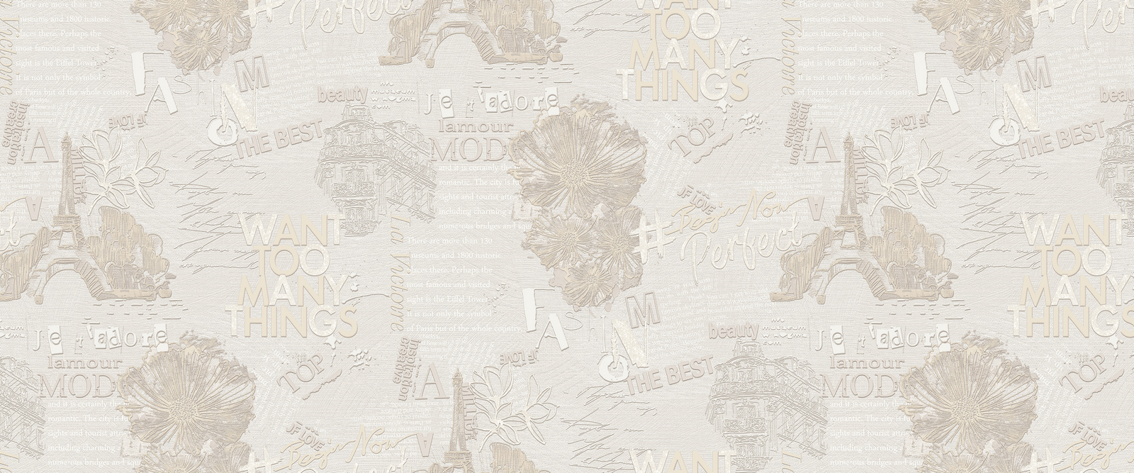 В основе коллекции лежит потрясающая текстильная штукатурка, да, Вы, правильно поняли, дизайнеры соединили пластику линий, рельеф венецианской штукатурки и структурность текстильной фактуры. Благородный монохром в сочетании с рельефным тиснением - разными по блеску - придутся по вкусу даже самым искушенным эстетам!