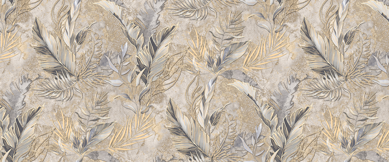 Мы решили в этой коллекции применить богатый декор и добавили на отдельные листочки эффект сияния с помощью крупных частиц в металлических оттенках: белом, мягком классическом, розовом золоте, платине. Сложный жаккард на фоне, равномерная композиция рисунка, великолепная техника тиснения и распределение по полотну цветовых нюансов — все это выделяет коллекцию на полке.
