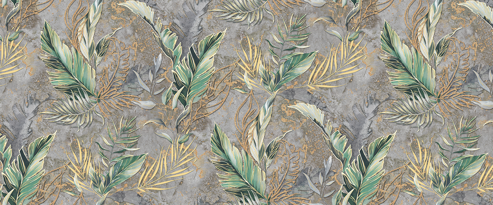 Мы решили в этой коллекции применить богатый декор и добавили на отдельные листочки эффект сияния с помощью крупных частиц в металлических оттенках: белом, мягком классическом, розовом золоте, платине. Сложный жаккард на фоне, равномерная композиция рисунка, великолепная техника тиснения и распределение по полотну цветовых нюансов — все это выделяет коллекцию на полке.