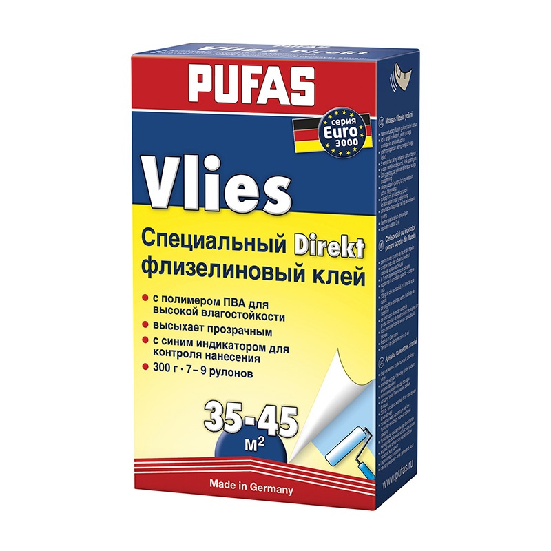 Разработан непосредственно для наклеивания флизелиновых обоев по технологии нанесения клея на стену. Применим для наклеивания других видов обоев по технологии нанесения клея на обои. Синий индикатор позволяет контролировать равномерность нанесения клея. Расход: ок. 200–250 мл./м², 1 пачка на: 38 м², 45 м².