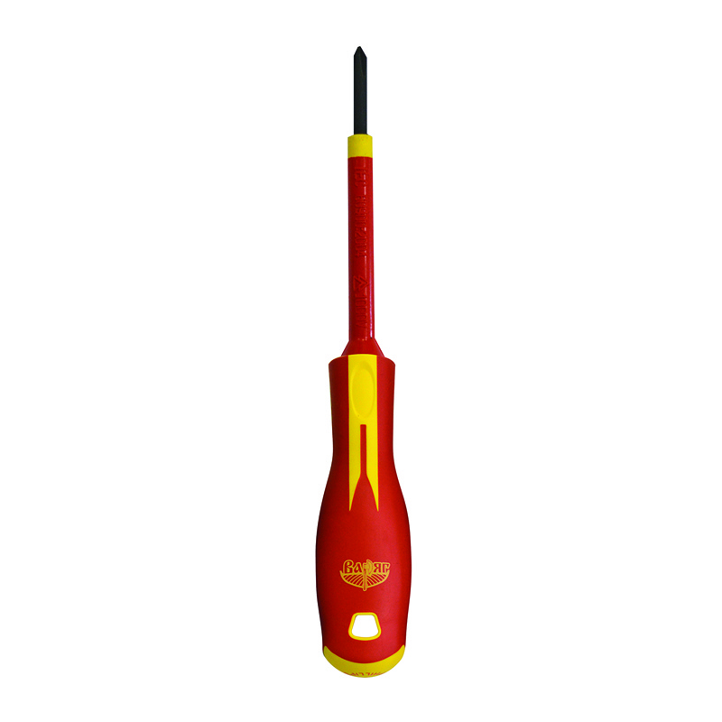 Предназначена для монтажа шлицевого крепежа. Крестовой шлиц. Специальная инструментальная сталь SVCM 59HRC. Эргономичная обрезиненная, противоскользящая, маслобензостойкая рукоятка. Магнитный наконечник. Защитная диэлектрическая оболочка стержня. Соответствует нормам ГОСТ 11516-94 и VDE. Для работ под напряжением до 1000В.
