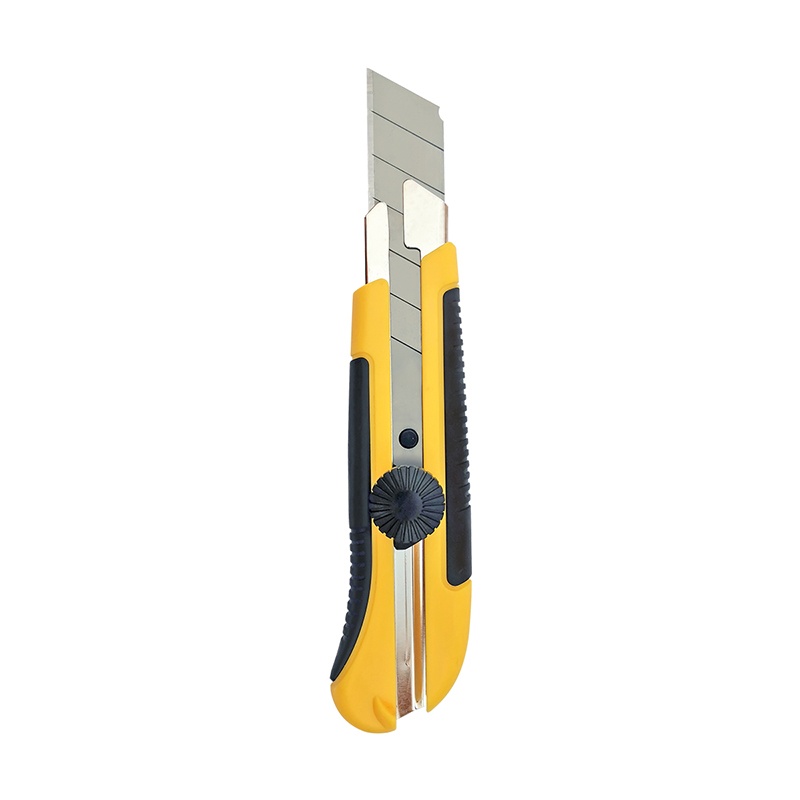 Предназначен для резки бумаги, картона, ткани и пластика. Пластмассовый обрезиненный корпус. Металлическая направляющая. Оснащен отламывающимся сегментированным лезвием.
