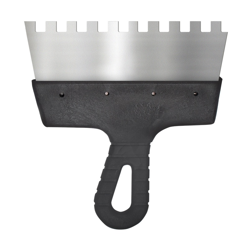 Предназначен для нанесения и выравнивания строительных смесей. Зубчатое полотно из нержавеющей стали. Рукоятка из пластмассы.