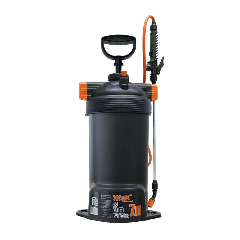 Опрыскиватель с брандспойтом и наплечным ремнём, используется для опрыскивания, подкормки и полива растений, кустарников, деревьев средней высоты, картофеля, а также для мытья стен, стекол и других хозяйственных работ. Брандспойт: алюминиевый (650мм). Регулировка распыла: от струи до тумана.