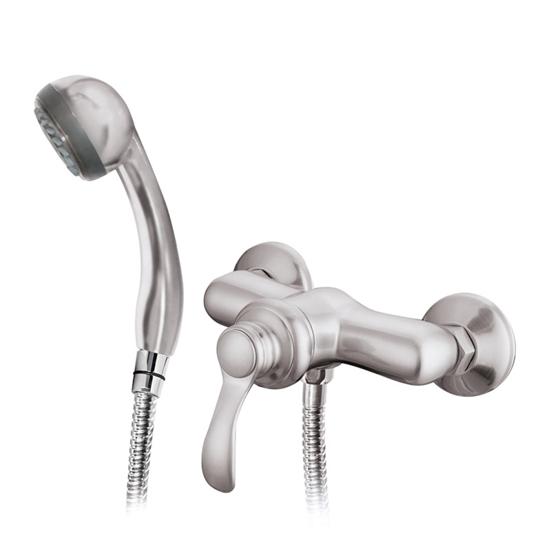 Выполнен из высококачественной латуни. Многослойное никель-хромовое покрытие. В комплектацию входит: смеситель, металлизированный шланг для душа, душевая лейка, пластиковый держатель для лейки с комплектом крепежа, эксцентрики, составные декоративные накладки, паспорт изделия.