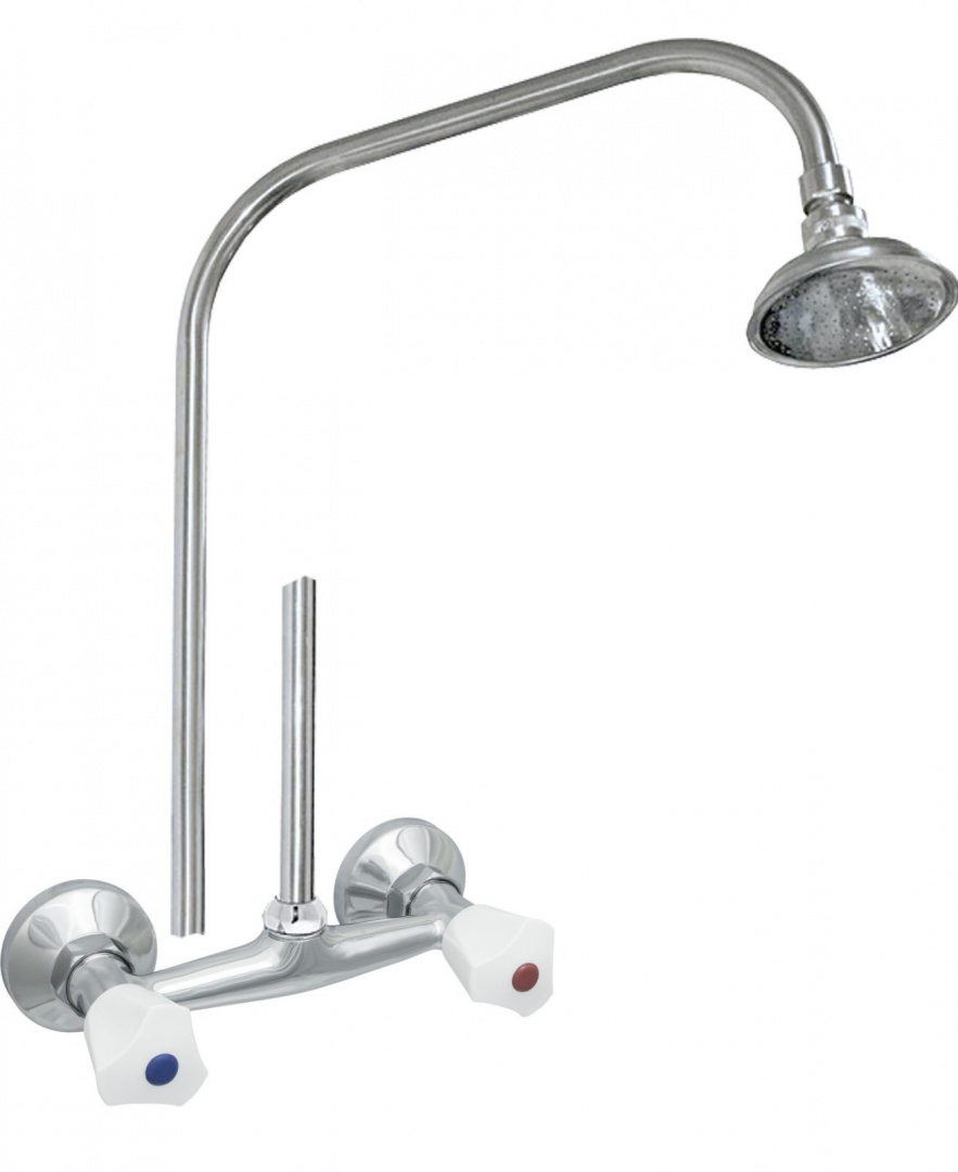 Смеситель монтируется на стену, высота стойки 1300 мм, высота до душевой лейки 1100 мм, вынос лейки 255 мм. Смешивание и подача горячей и холодной воды происходит с помощью двух белых пластиковых маховиков с резиновыми кран-буксами.
