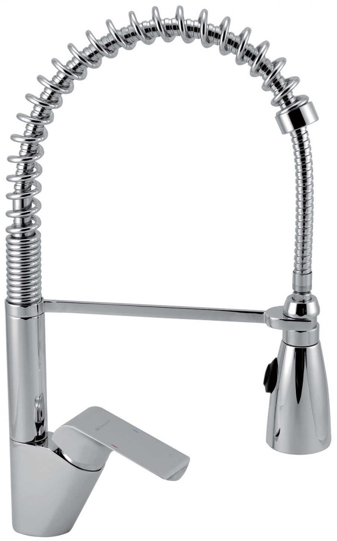 Смеситель для мойки с выдвижным гибким изливом польского бренда сантехники Ferro изготавливают из высококачественной латуни с последующим нанесением защитного хромированного покрытия.
