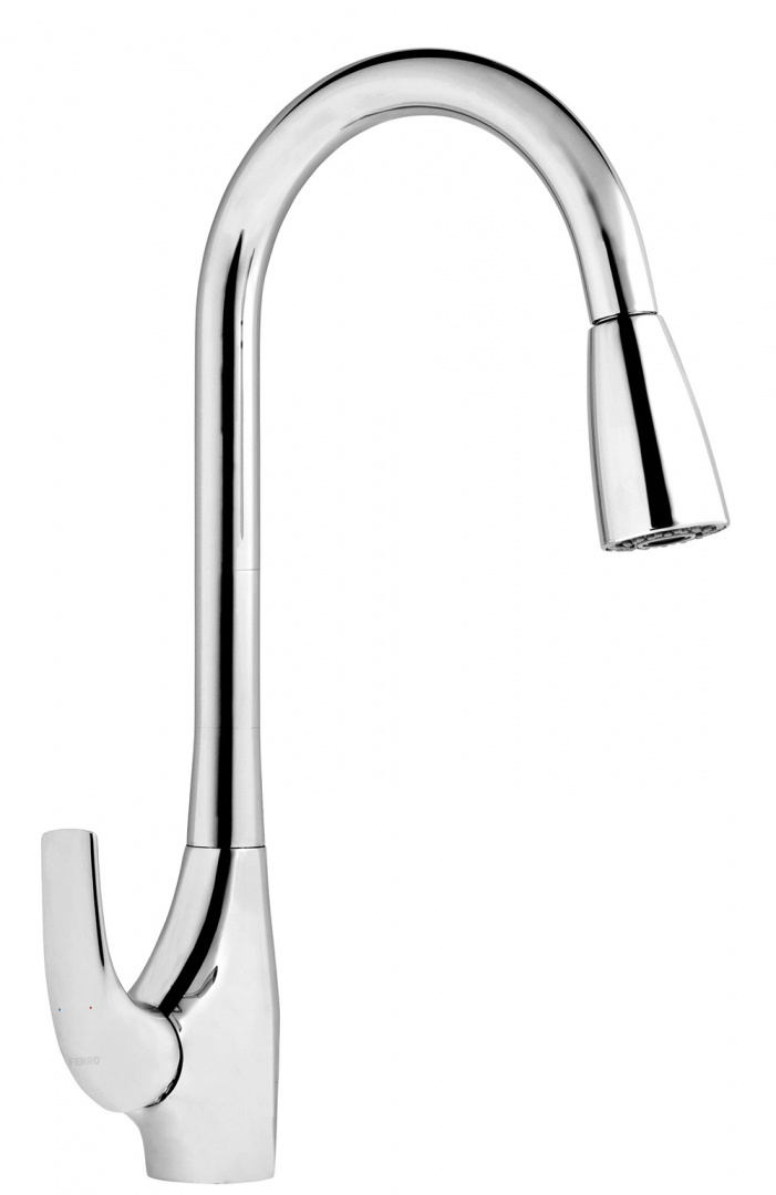 Смеситель для кухни с выдвижным изливом Genova VerdeLine BGE8AVL-12 польского бренда сантехники Ferro изготавливают из высококачественной латуни с последующим нанесением защитного хромированного покрытия.