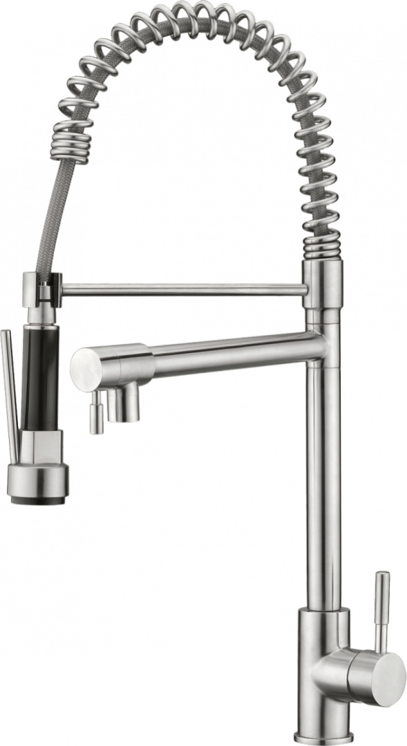 Смеситель для кухни LEDEME L76005-2 в коллекции смесителей из нержавеющей стали предназначен для установки на кухонную мойку, конструктивно представляет из себя высокий смеситель с выдвижным шлангом с посадочным местом в виде жесткой пружины и поворотным изливом. Смешивание и подача воды происходит с помощью керамического картриджа диаметром 35 мм и металлической ручки. В комплекте подводка для подключения воды 1/2" и необходимые крепления.