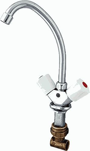 Смеситель для кухни ЦС-СМ 13 серии "Стандарт" от подольской производственно-торговой группы "Центр Сантехники" предназначен для установки в мойку или раковину и представляет собой конструкцию с двумя маховиками и поворотным изливом.