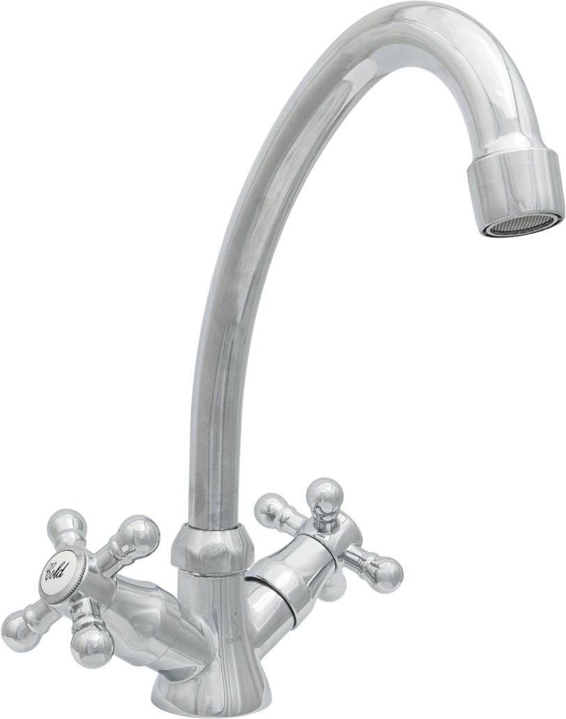 Смеситель для кухни ЦС-СМ 25 серии "Стандарт" от подольской производственно-торговой группы "Центр Сантехники" предназначен для установки в мойку или раковину и представляет собой конструкцию с двумя маховиками и поворотным изливом.
