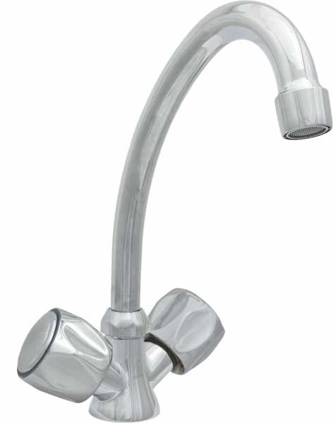 Смеситель для кухни ЦС-СМ 25 серии "Стандарт" от подольской производственно-торговой группы "Центр Сантехники" предназначен для установки в мойку или раковину и представляет собой конструкцию с двумя маховиками и поворотным изливом.