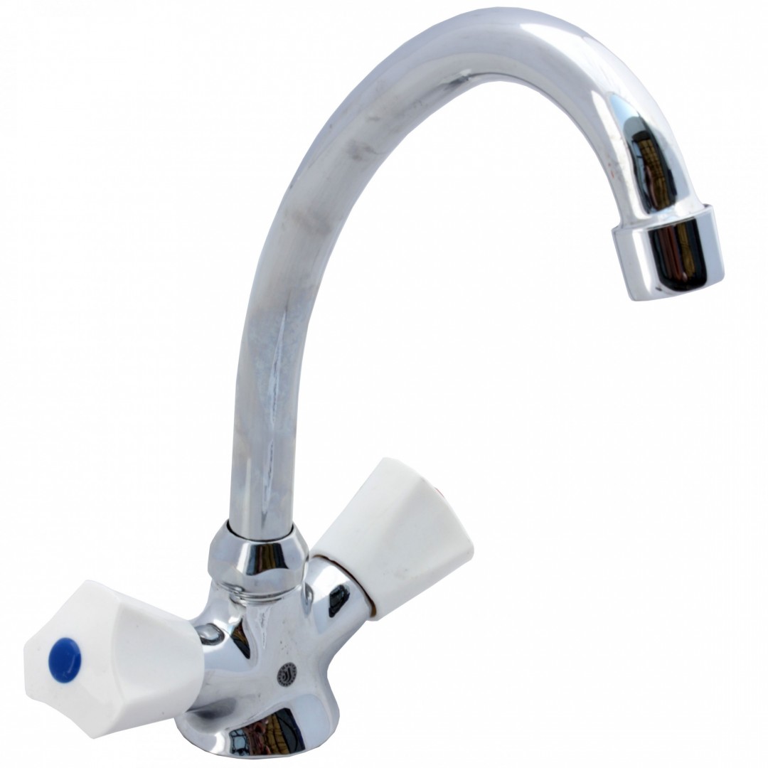 Смеситель для кухни ЦС-СМ 25 серии "Стандарт" от подольской производственно-торговой группы "Центр Сантехники" предназначен для установки в мойку или раковину и представляет собой конструкцию с двумя маховиками и поворотным изливом.