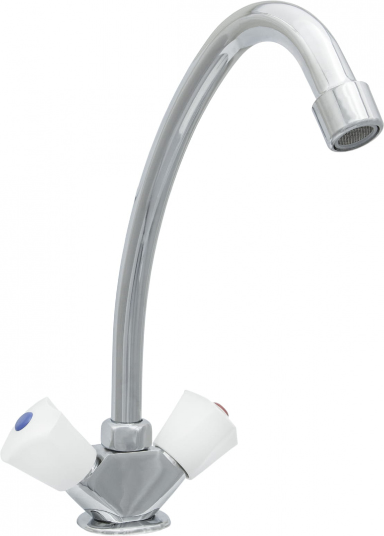 Смеситель для кухни ЦС-СМ 12 серии "Эко" от подольской производственно-торговой группы "Центр Сантехники" предназначен для установки в мойку или раковину и представляет собой конструкцию с двумя маховиками и поворотным изливом.