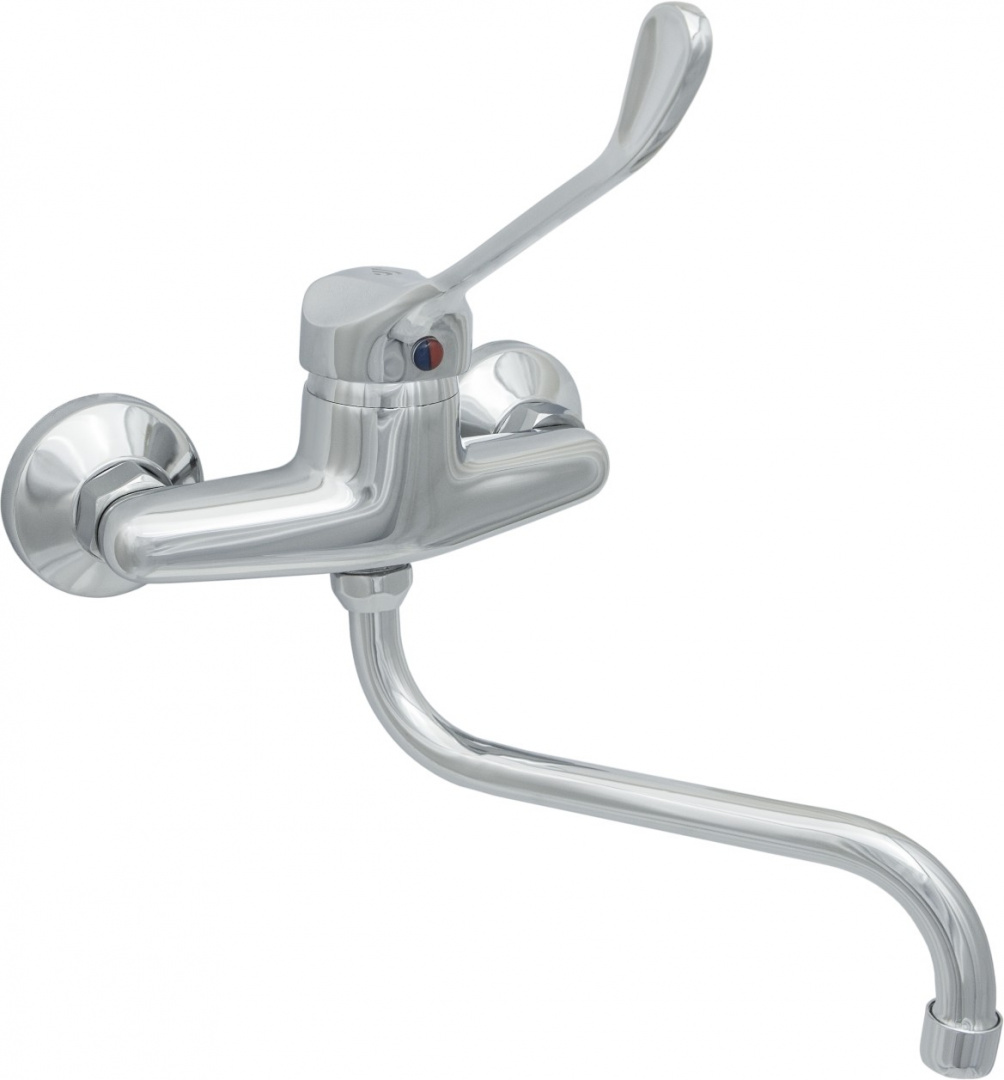 Хирургический настенный смеситель для мойки/умывальника ЦС-СМ 294-2 серии "Медик" от подольской производственно-торговой группы "Центр Сантехники" предназначен для использования в кухонных мойках, раковинах или умывальниках медицинских учреждений и представляет собой настенную конструкцию с одной локтевой ручкой М44 и круглым изливом.