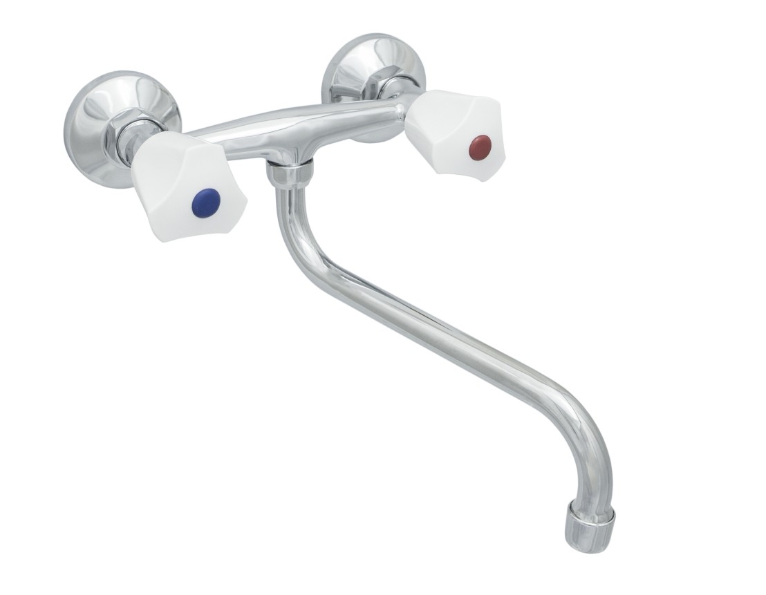 Настенный смеситель для мойки/умывальника ЦС-СМ 294 от подольской производственно-торговой группы "Центр Сантехники" предназначен для использования в кухонных мойках или умывальниках и представляет собой настенную конструкцию с двумя маховиками и нижним изливом.