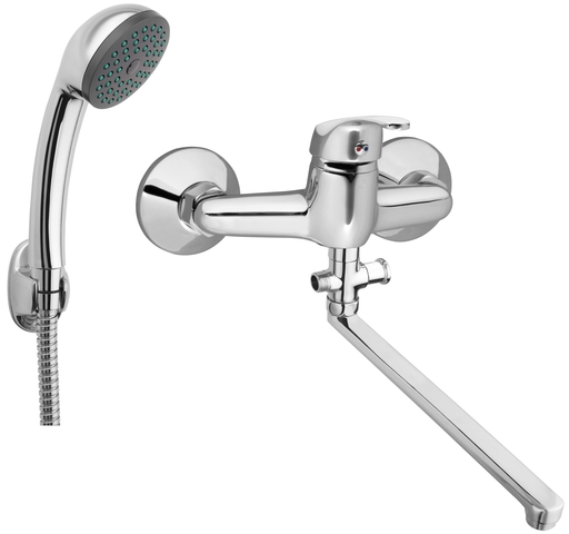 Смеситель для ванны Basic BBC55A польского бренда сантехники Ferro изготавливают из высококачественной латуни с последующим нанесением защитного хромированного покрытия. Смеситель Ferro Basic BBC55A предназначен для использования в ванных комнатах и монтируется на стену. Подача и смешивание воды происходит с помощью ручки и керамического картриджа диаметром 35 мм, плоский поворотный излив длиной 300 мм. Гибкий шланг с лейкой для душа крепится на стене, длина шланга в оплетке из нержавеющей стали 1,5 м, между лейкой и изливом переключение происходит с помощью кнопочного дивертора с керамическим регулятором. В комплект смесителя Ferro BBC55A входят также монтажные эксцентрики, декоративные отражатели, крепление на стену для лейки.