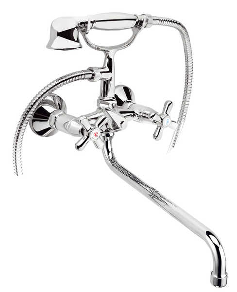 Смеситель Ferro Retro XR11A предназначен для использования в ванных комнатах и монтируется на стену. Подача и смешивание воды происходит с помощью двух маховиков с резиновыми кран-буксами и круглого поворотного излива длиной 300 мм. Гибкий шланг с лейкой для душа крепится на смеситель, длина шланга с оплеткой из нержавеющей стали 1,5 м, между лейкой и изливом переключение происходит с помощью керамического дивертора.