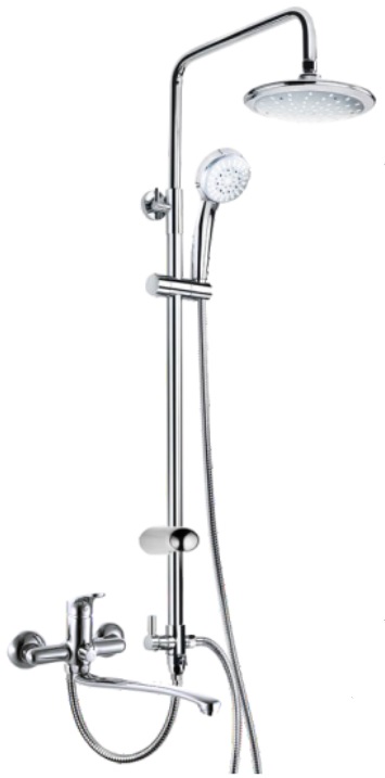 Смеситель для ванны и душа ЦС-СМ 300-4 от подольской производственно-торговой группы "Центр Сантехники" предназначен для использования в ванных комнатах и представляет собой смеситель для ванны с длинным изливом и душевую стойку с душевой лейкой на гибком шланге и верхней лейкой "тропический дождь".