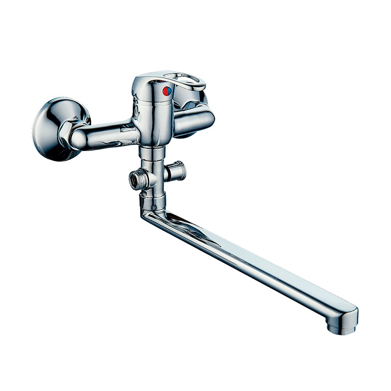 Однозахватный пристенный смеситель для ванны с ручкой типа "B" из цинкового сплава и с отверстием на рычаге. Плоский поворотный излив из нержавеющей стали оснащен качественным аэратором с пластиковым сердечником типа "Бенц".