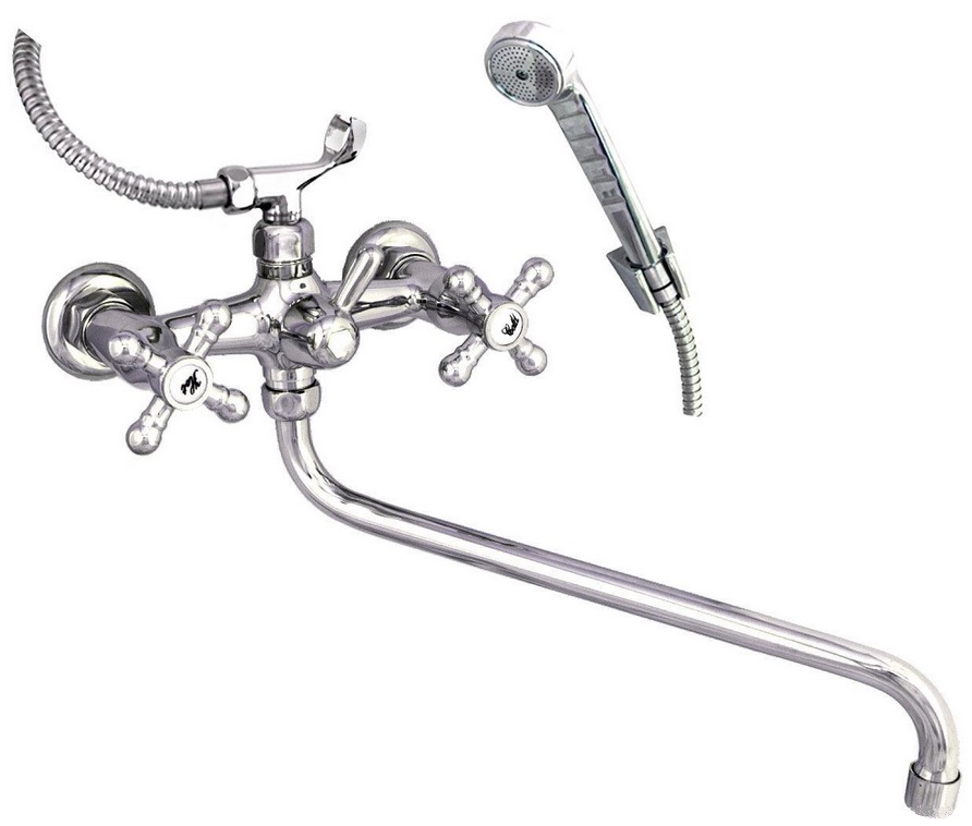 Смешивание и подача горячей и холодной воды происходит с помощью пластиковых хромированных маховиков Крест с керамическими кран-буксами, переключение режима подачи воды излив/лейка с помощью шарового механизма, длина излива 315 мм, длина душевого шланга 1,5 м.