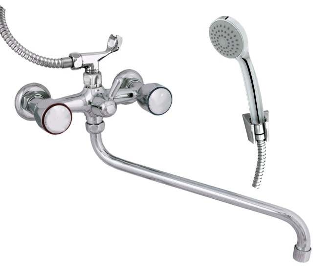 Смешивание и подача горячей и холодной воды происходит с помощью пластиковых хромированных маховиков Глобо с керамическими кран-буксами, смена режима подачи воды излив/лейка с помощью переключателя с золотниковым механизмом, длина излива 300-320 мм, длина душевого шланга 1,5 м.
