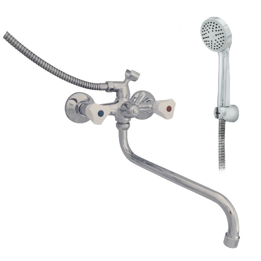 Смешивание и подача горячей и холодной воды происходит с помощью белых пластиковых маховиков с керамическими кран-буксами, смена режима подачи воды излив/лейка с помощью переключателя с золотниковым механизмом, длина излива 300-320 мм, длина душевого шланга 1,5 м.