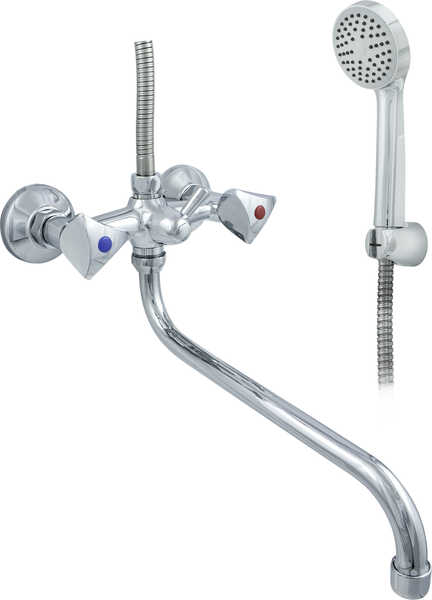 Смеситель для ванны ЦС-СМ 600/3-4К от подольской производственно-торговой группы "Центр Сантехники" предназначен для использования в ванных комнатах и представляет собой настенную конструкцию с двумя маховиками, длинным круглым изливом и душевой лейкой на гибком шланге.